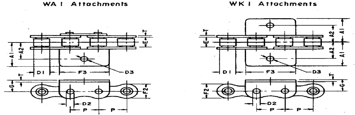 | ANSI Chain No. | PxE | F2 | D1 | D2 | A1 | A2 | F3 | D3 | G | T | Ave. Ulti. Strength kg | |